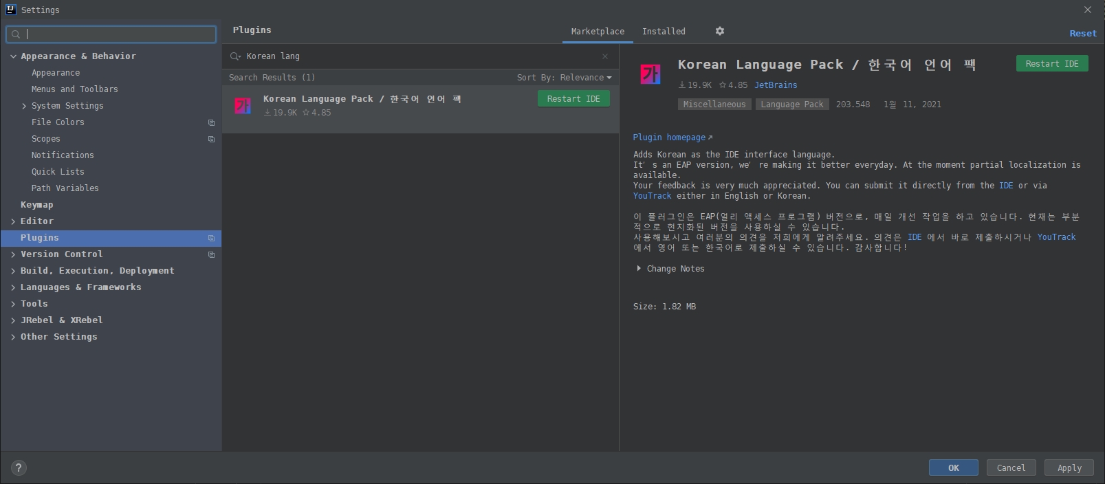 plugins.jetbrains.com/plugin/13711-korean-language-pack------