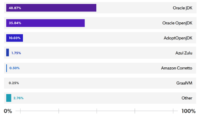 2018년 7월부터 Oracle JDK는 유료 구독형 라이센스가 되었습니다. 이로 인해 Java 기반 애플리케이션 기업에서 많은 혼란이 있었던 것으로 기억납니다. 그래프에서 알 수 있듯이 Oracle JDK가 48.87%로 가장 높습니다. OpenJDK와 13%정도 차이 납니다.