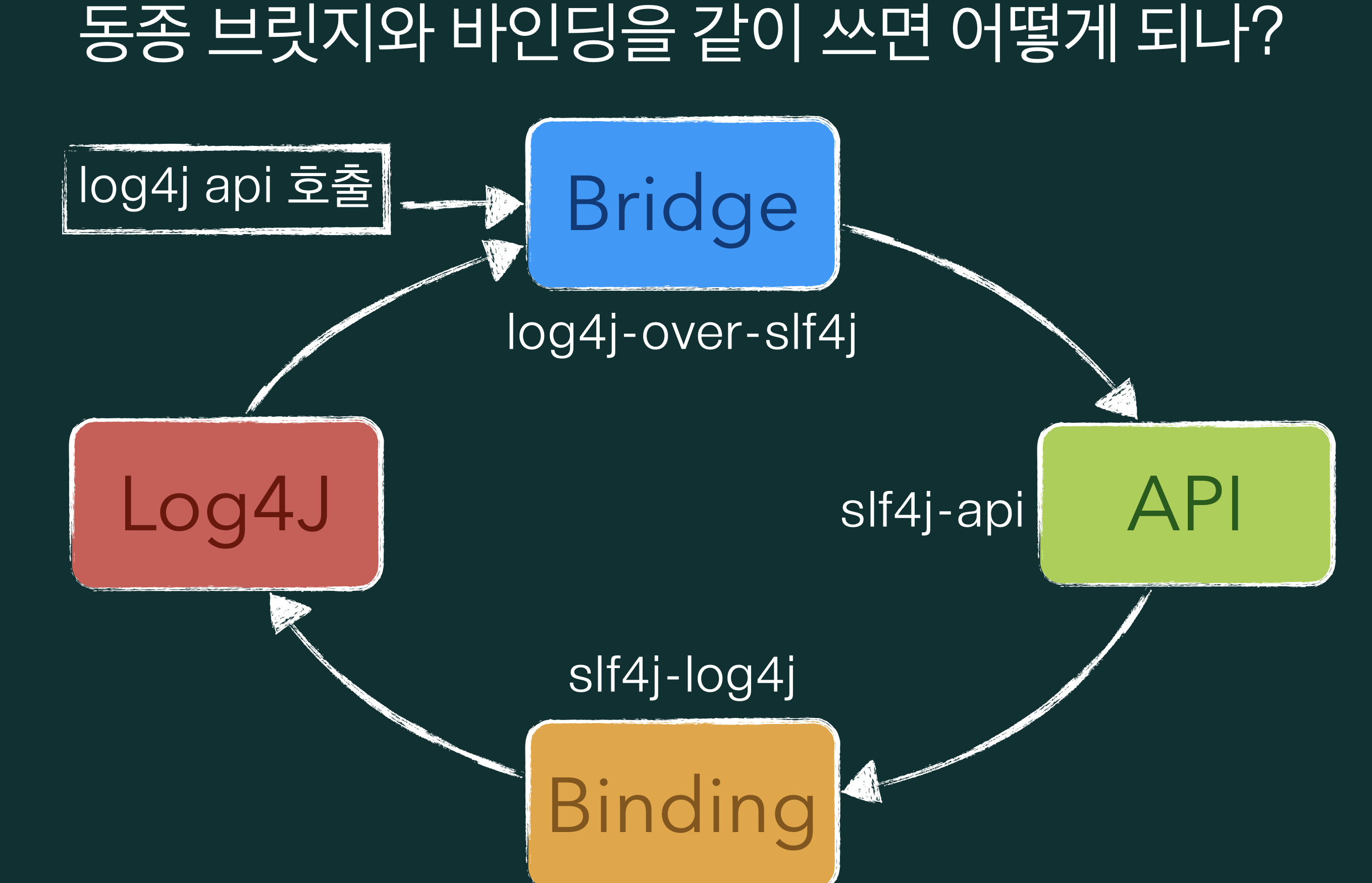 1. log4j API 를 호출하면 -> 2. 모든 logging은 가짜 Log4j 인 Bridge를 호출하고 -> 3. Bridge 는 SLF4J API 를 호출하고 -> 4. SLF4J 는 Binding 을 통해서 Log4j 를 호출한다. |
