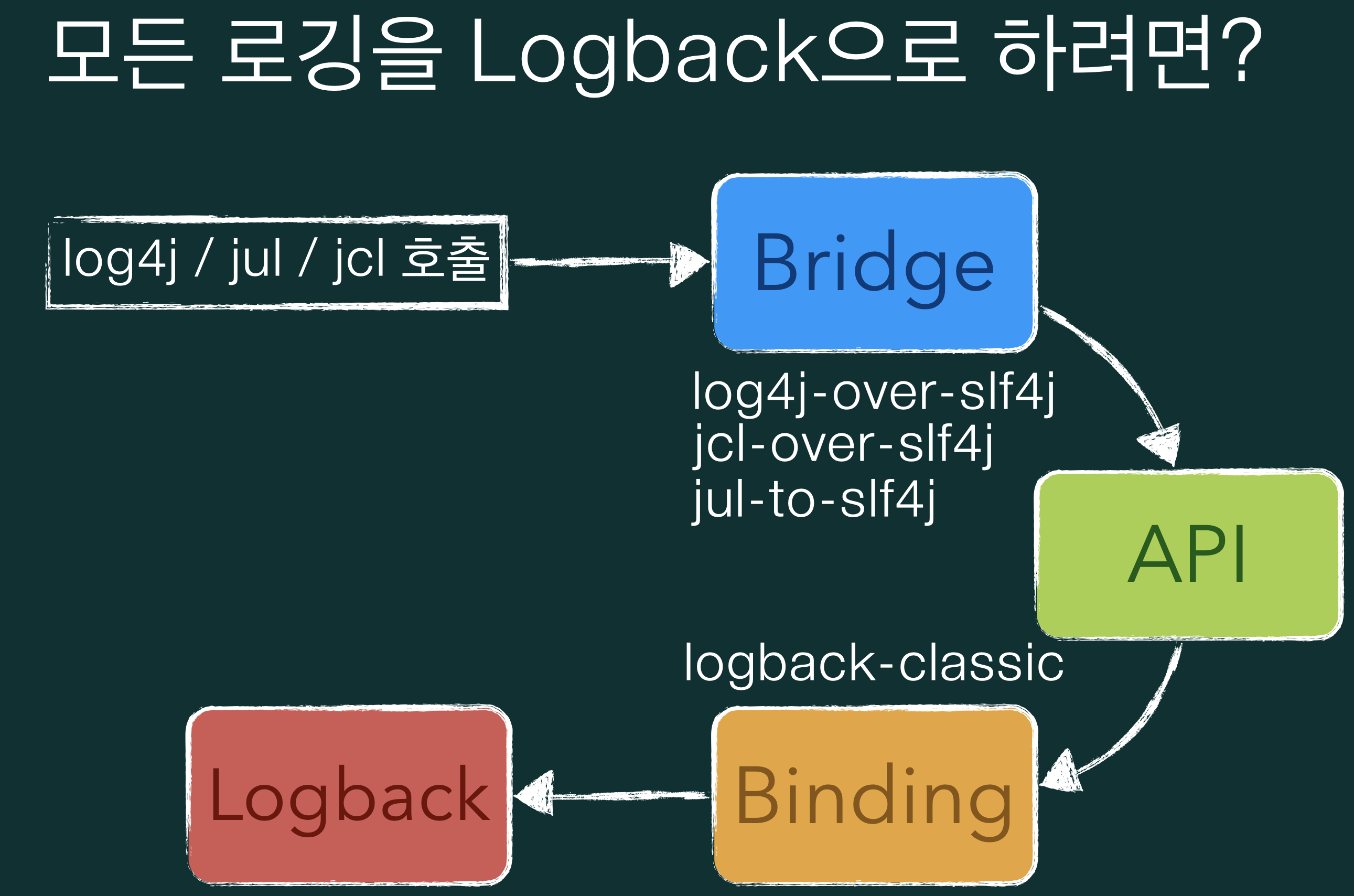 | 1. logbak 을 제외한 모든 Bridge 라이브러리를 넣어준다. 2. 모든 Log api 호출은 SLF4J 를 호출하고 3. SLF4J 는 Logback 만을 호출한다. |