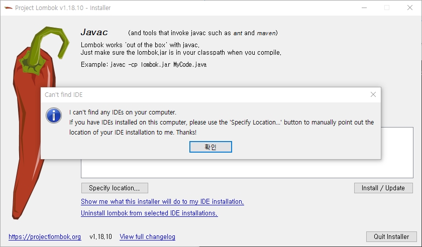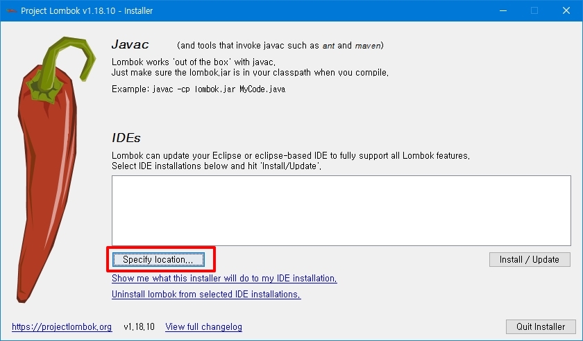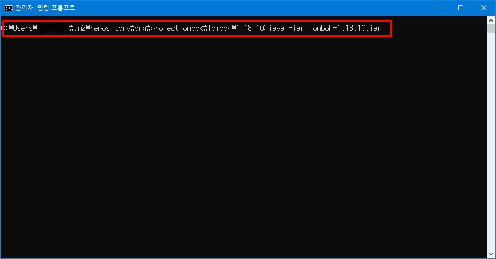 1. lombok.jar 파일과 java 명령을 실행 합니다. ( java -jar lombok.jar )