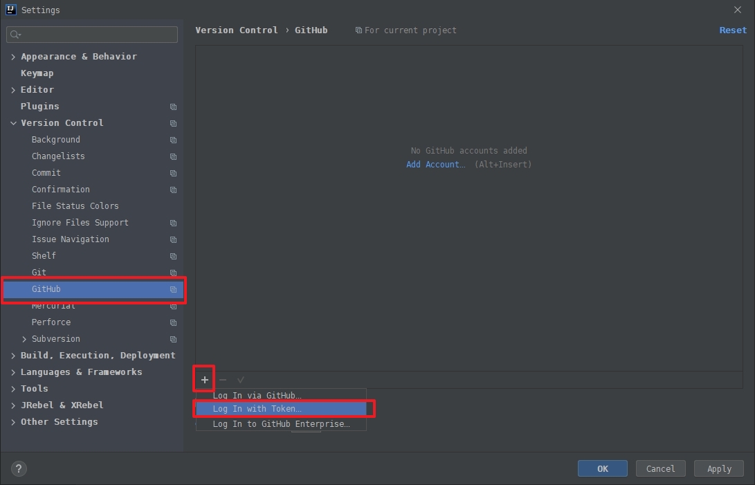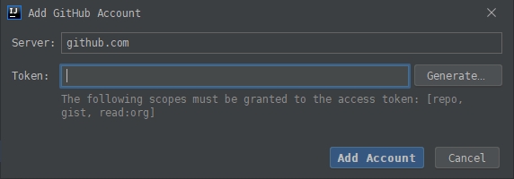 Add Account : 선택하면 IntelliJ 계정과 설정된 GitHub 와 연결해줍니다. ( 간단하게 추가적인 설정이 필요합니다. )