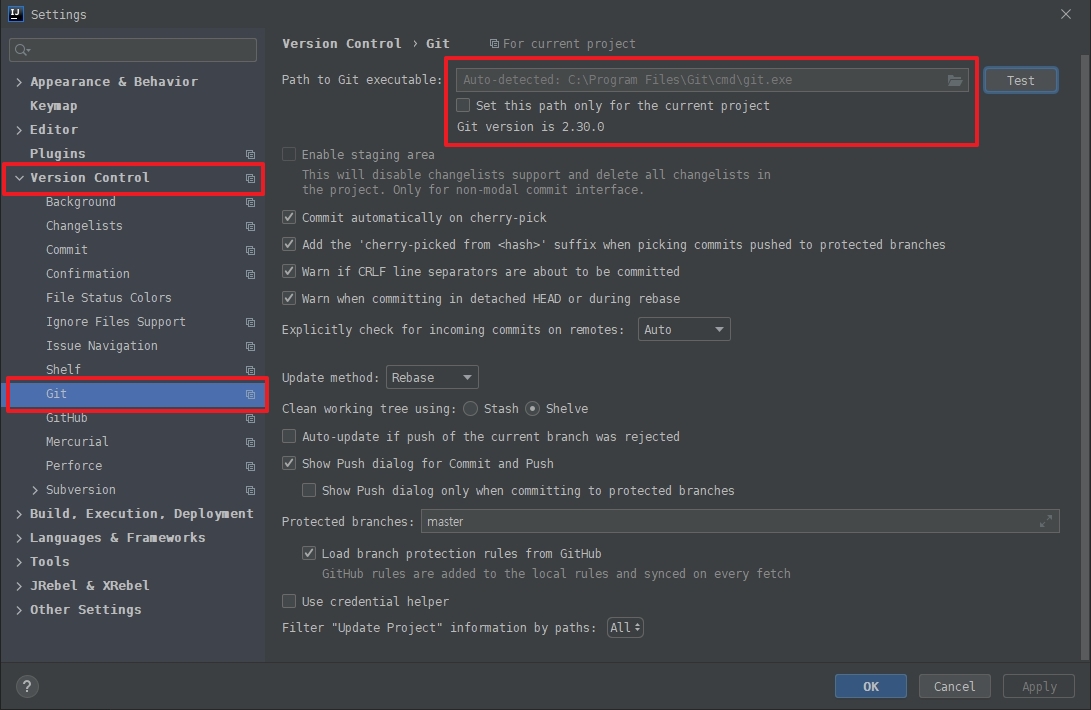 3. IntelliJ에서 Git 파일 연결하기 ( git.exe 파일을 찾아 연결해주면 됩니다.)