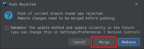 4. Rebase 또는 Merge 를 선택해야 합니다. ( 여기서는 Merge 를 선택합니다. )