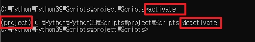 다시 deactivate.bat를 실행하면 가상환경이 비활성화됩니다. 프롬프트라인에 '(project)' 단어가 사라집니다.