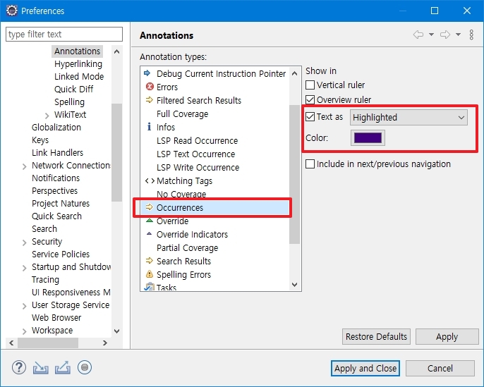 [ Window >> Preferences >> General > Editors > Text Editors > Annotations > Occurences ]