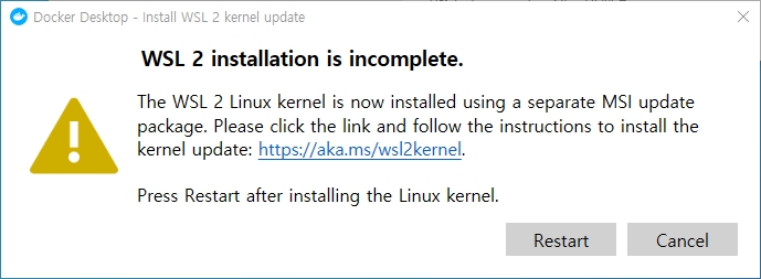 Restart 하면 WSL2 Linux Kernel 을 설치하라는 메시지 창이 보여집니다.