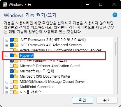 Windows11에 Docker를 설치하기 위해서는 Hyper-V 기능이 켜져 있어야 합니다.