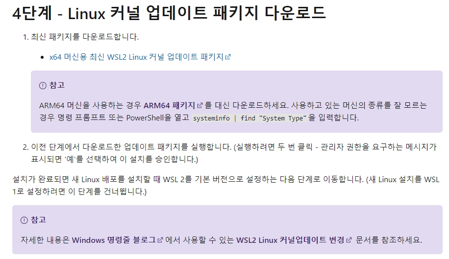 docs.microsoft.com/ko-kr/windows/wsl/install-win10#step-4---download-the-linux-kernel-update-package