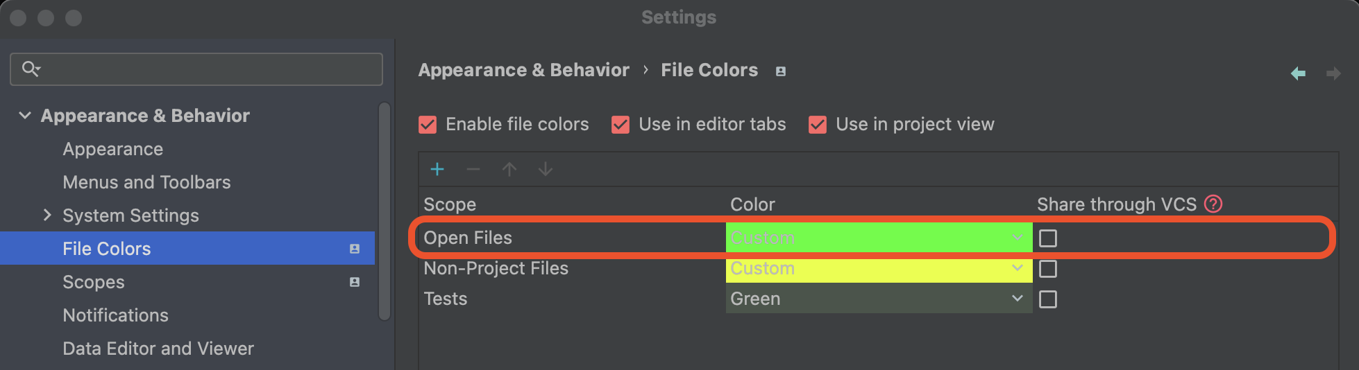[ File >> Settings >> Appearance & Behavior >> File Colors ]