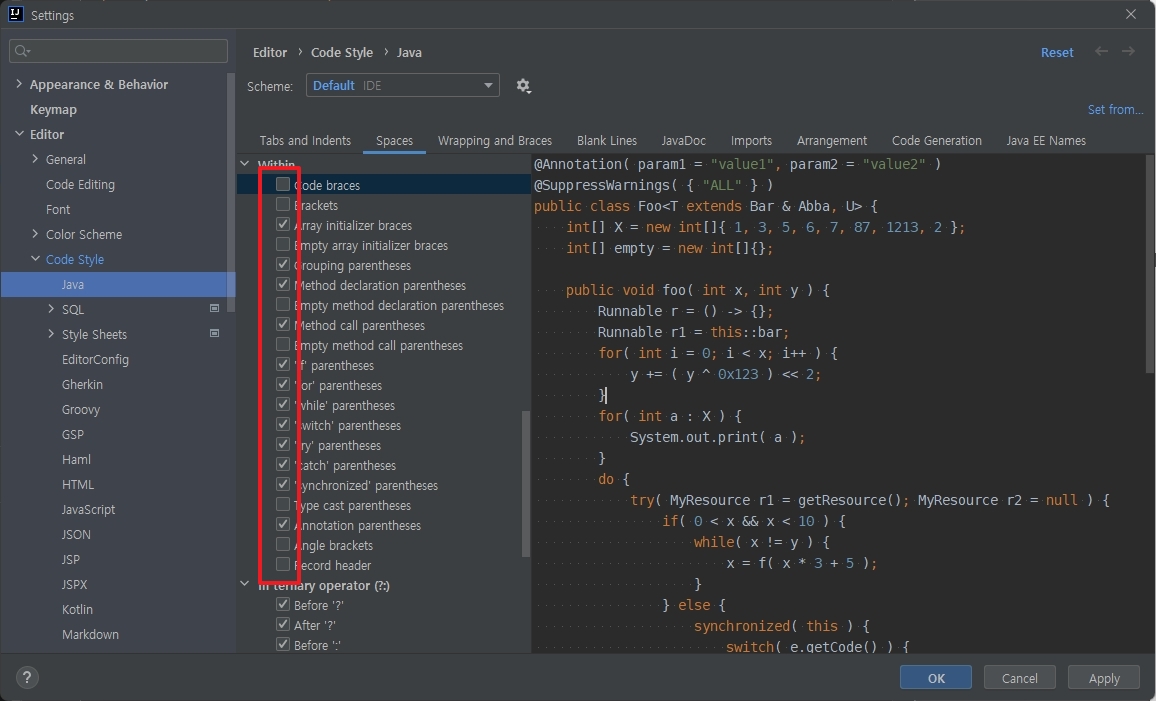 소스정렬 ( Ctrl + Alt + L )을 했는데, 세미콜론의 줄이 개행되지 않습니다.