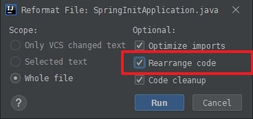 이 경우는 Reformat ( Ctrl + Shift + Alt + L ) 에서 Rearrange code 를 체크하지 않은 때문입니다.