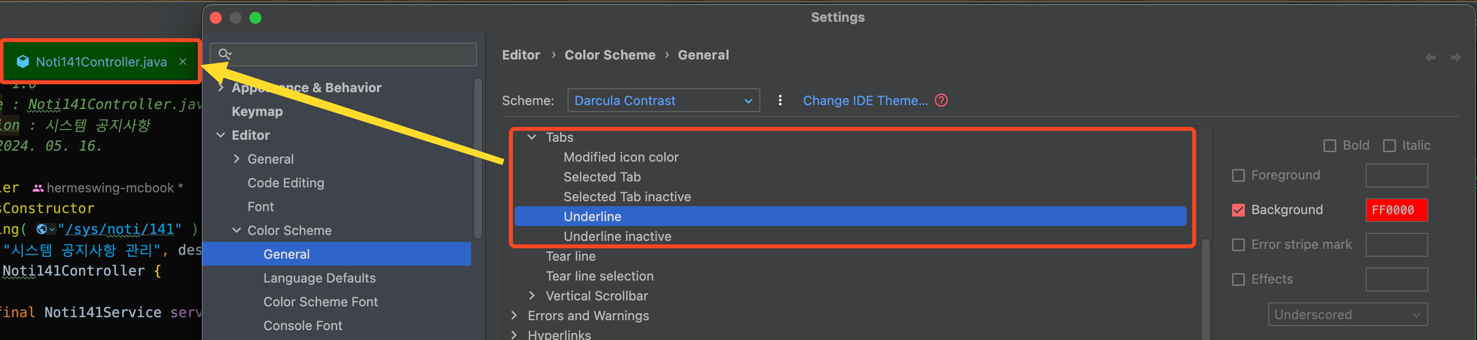 2-4-3. 오픈된 파일 Tab 배경색 변경 ( Seheme : Darcula Contrast 를 적용했는데, 그게 우선인 듯 합니다. 적용이 잘 안되네요. )
