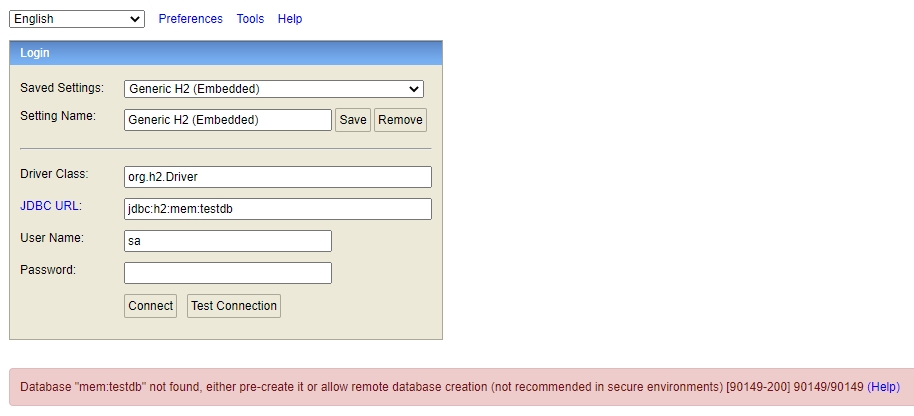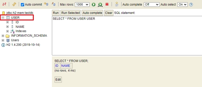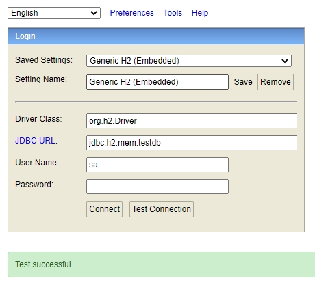 URL : jdbc:h2:mem:testdb