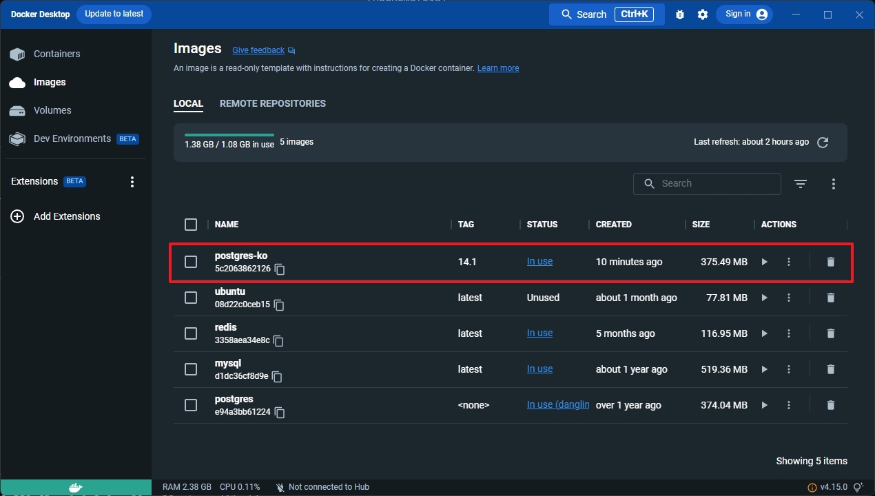 postgres <none> e94a3bb61224 11 months ago 374MB