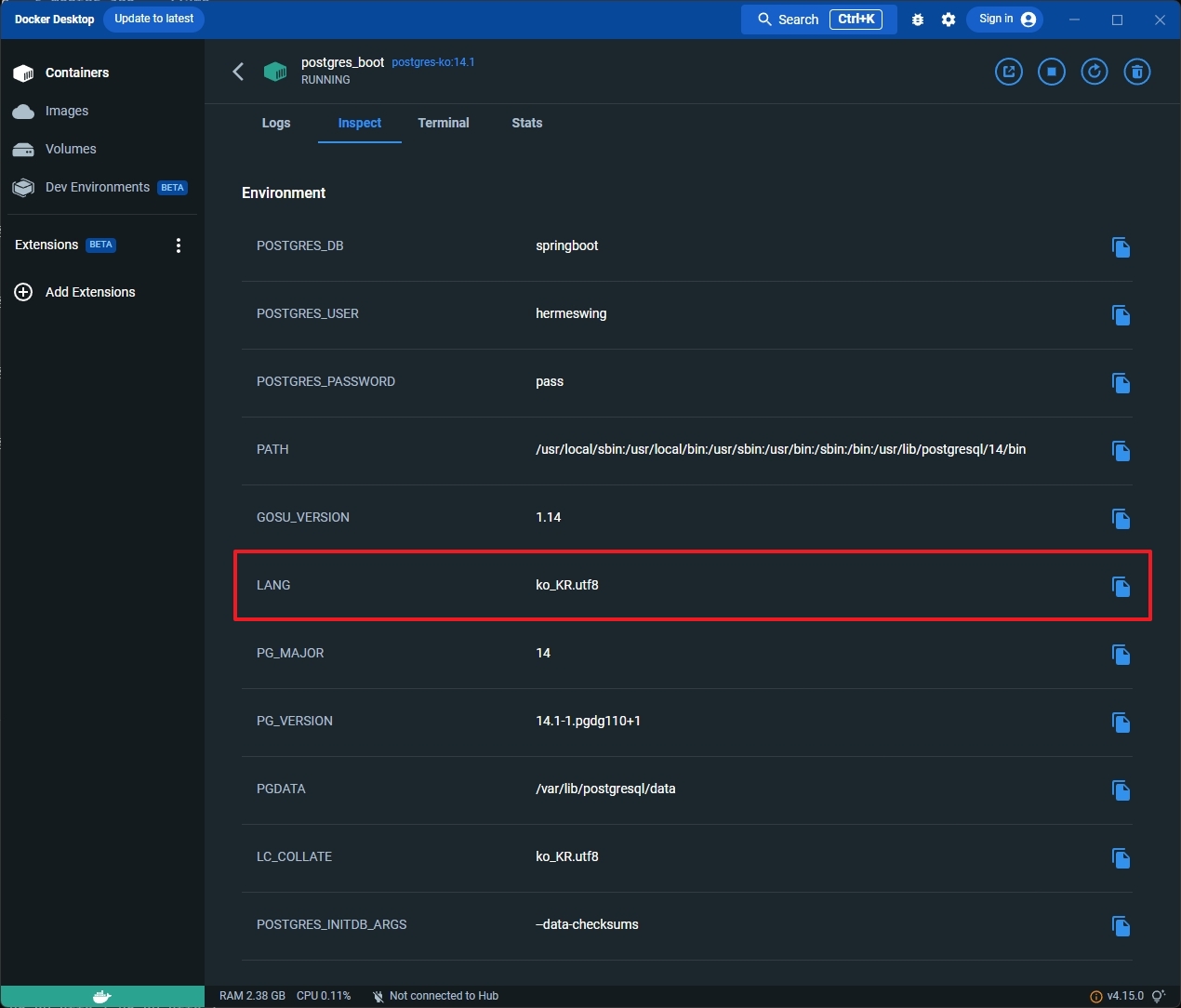 C:\>docker run -p 5432:5432 --name postgres_boot -e POSTGRES_DB=springboot -e POSTGRES_USER=hermeswing -e POSTGRES_PASSWORD=pass -d postgres