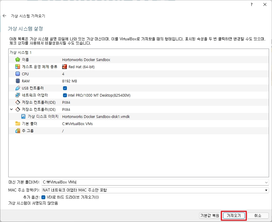 3. VirtualBox에 호튼웍스 샌드박드 등록 ( HortonWorks Sandbox Import )