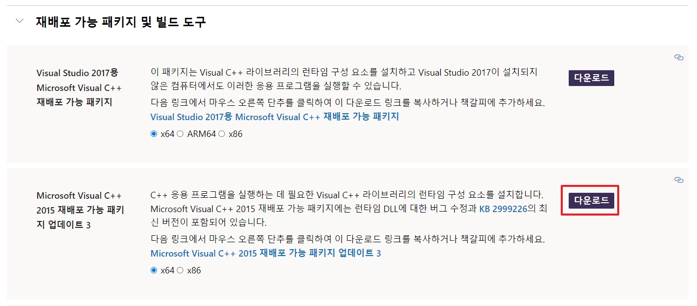 1. Visual C++ 재배포 모듈 설치 - 2015 Version 이상을 설치해야 합니다.