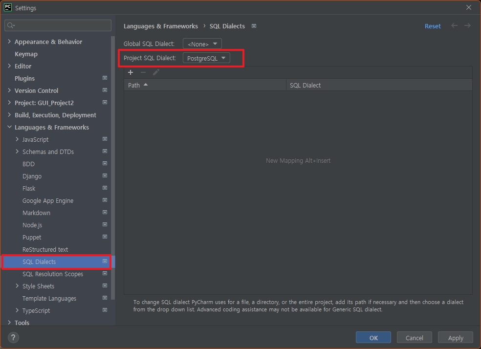 [File] > [Setting] > [Language & Frameworks] > [SQL Dialects]
