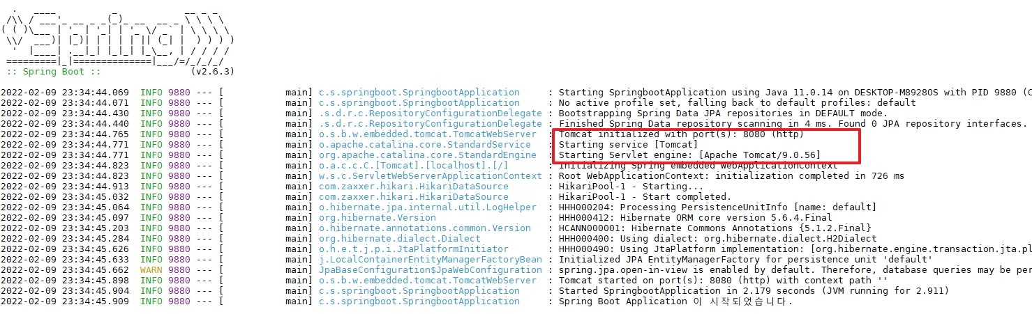 - Tomcat 이 9.0.56 버전이고, 8080 Port로 시작된것이 보여집니다. ( 내장 Tomcat 엔진이 실행됐습니다. )