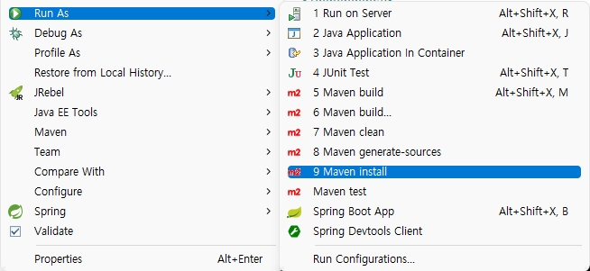 1. 프로젝트 폴더 > Run As > Maven Clean
