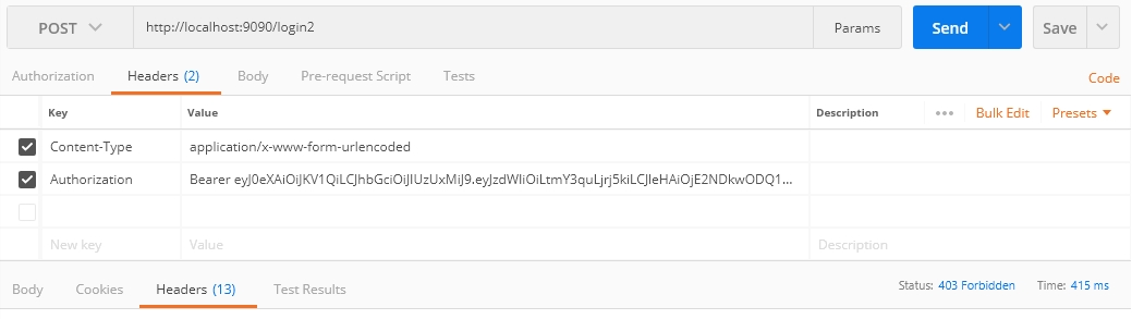 Header 에 Authorization 정보를 http://localhost:9090/login 에서 받았던 Authorization 로 채워넣습니다.