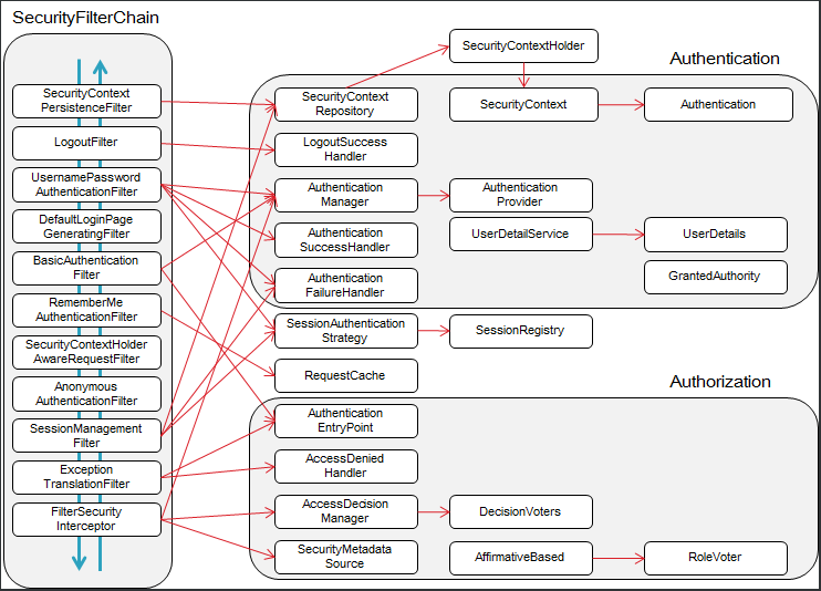 Spring Security를 커스터마이징하기 위해서는 그리고 이해하기 위해서는 아래 필터 체인을 이해하는 것이 좋다. 아래 그림은 인터넷에 돌아다니는 Spring Security 호출 그림을 내가 다시 깔끔하게 그