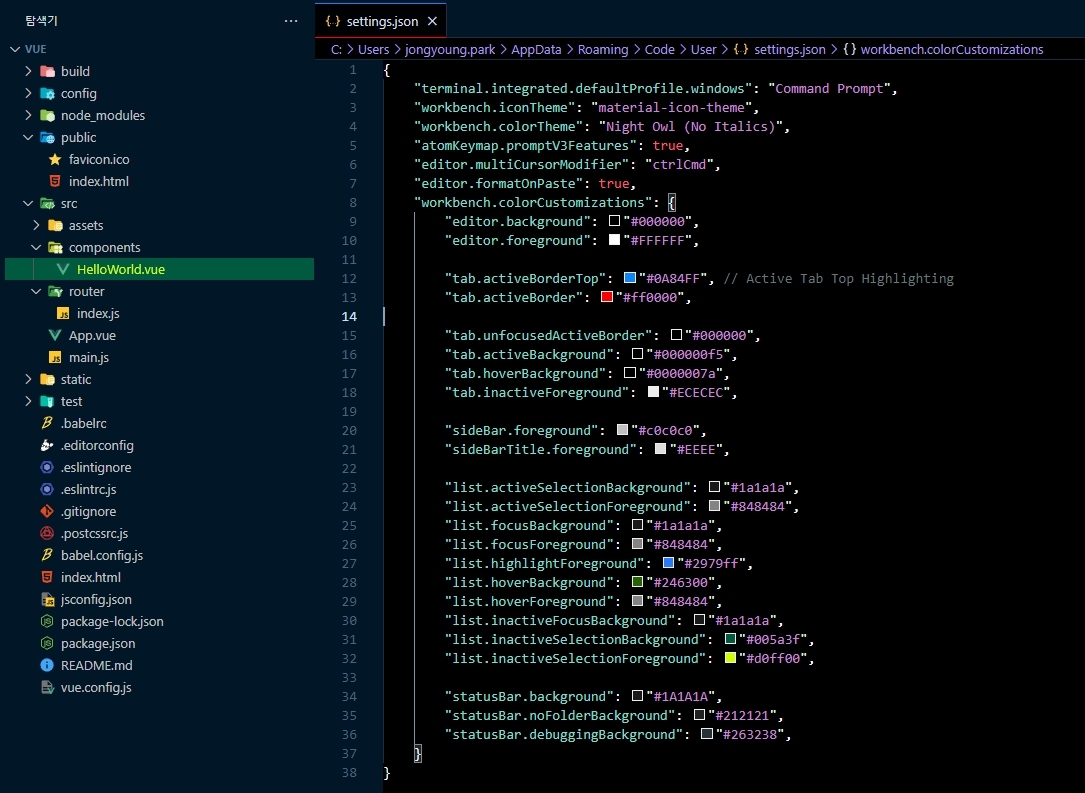 c:/Users/[사용자계정]/AppData/Roaming/Code/User/setting.json 파일