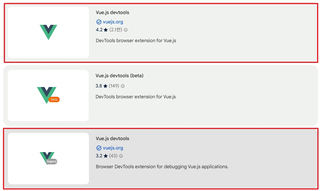 "Vue.js devtools" 란 단어로 검색을 하면 Vue.js devtools 가 두 개가 보여집니다. ( https://chromewebstore.google.com/search/Vue.js%20devtools )