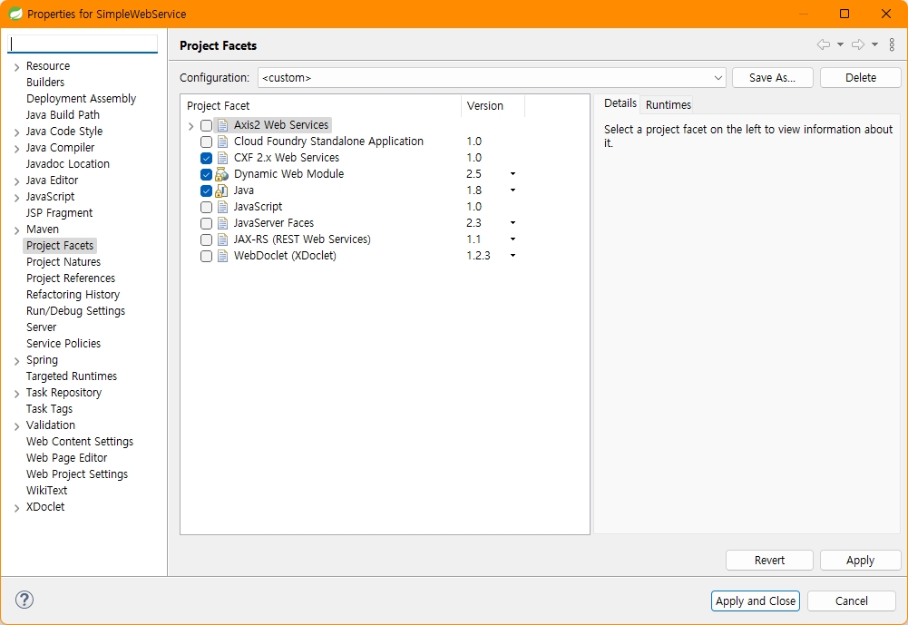 [Eclipse 프로젝트] > Properties > Project Facets 설정