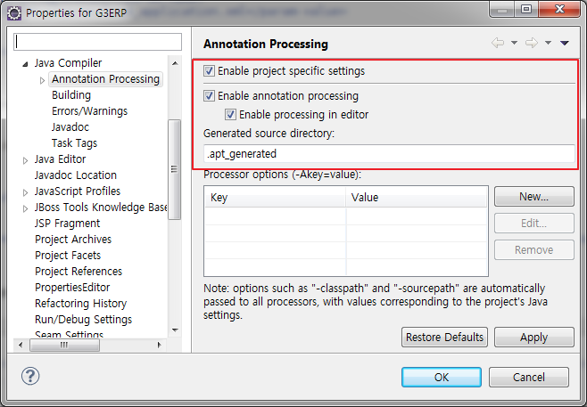 [Eclipse 프로젝트] > Properties > Java Compiler > Annotation Processing