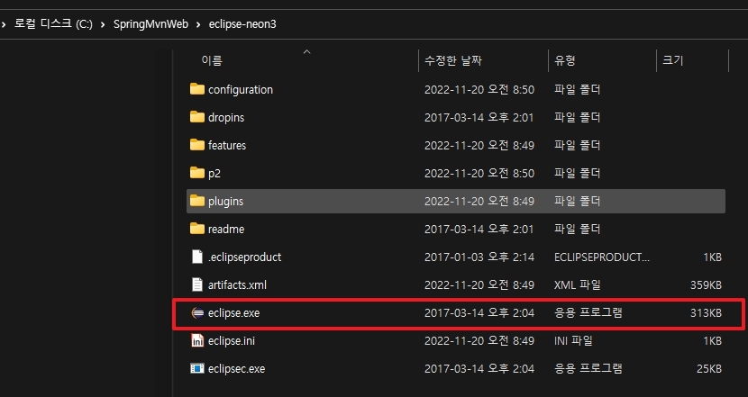 실행 - eclipse.exe 파일을 실행합니다.