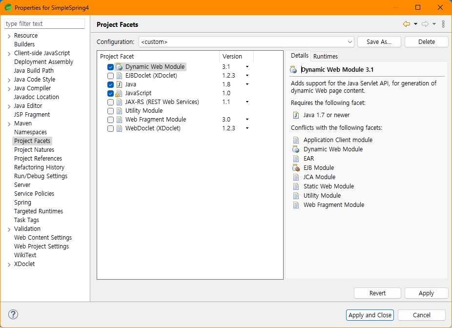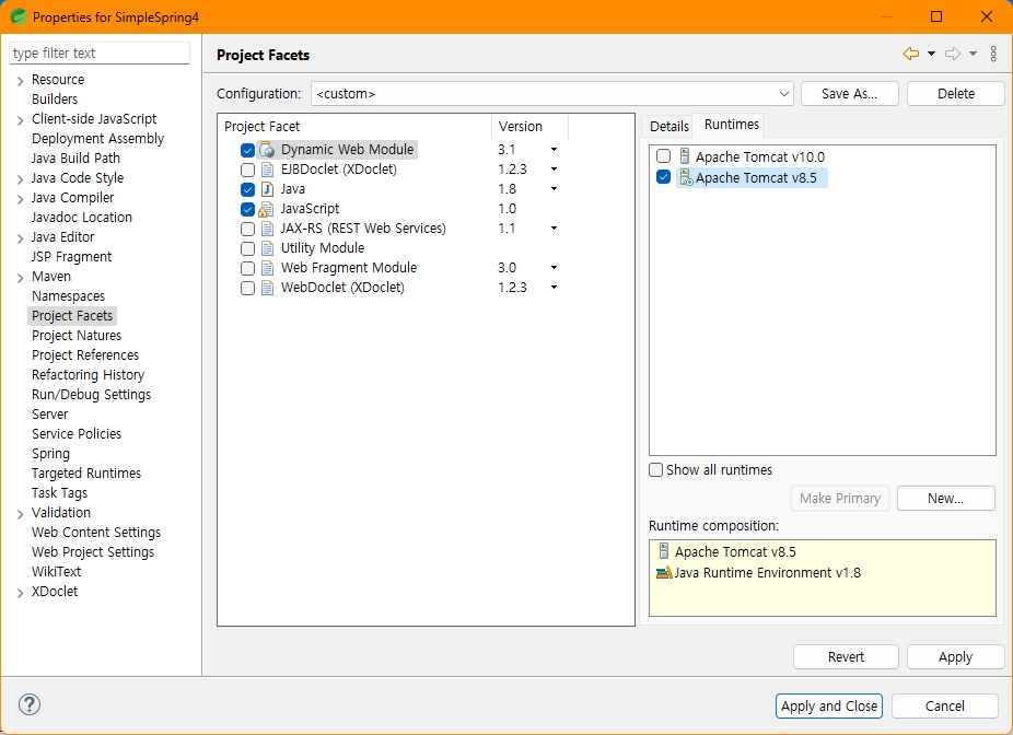 2. SimpleSpring4 프로젝트 > Properties > Project Facets - Runtimes