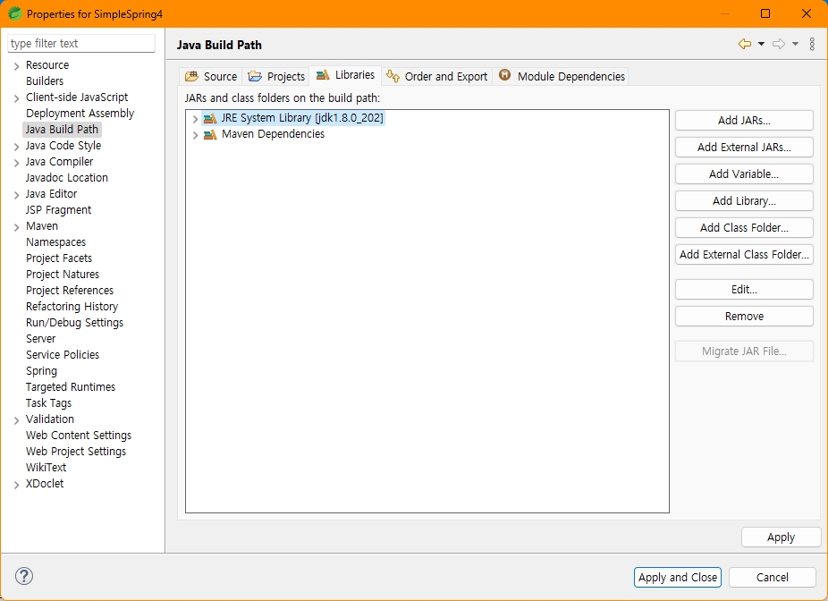 4. SimpleSpring4 프로젝트 > Properties > Java Build Path > Libraties > Add Library