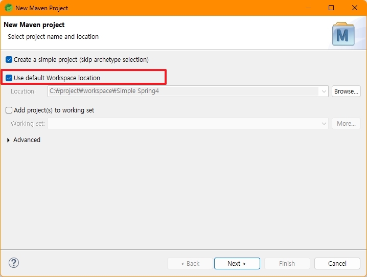 2. Use default Workspace Location -> 체크 풀고, 경로를 생성합니다.