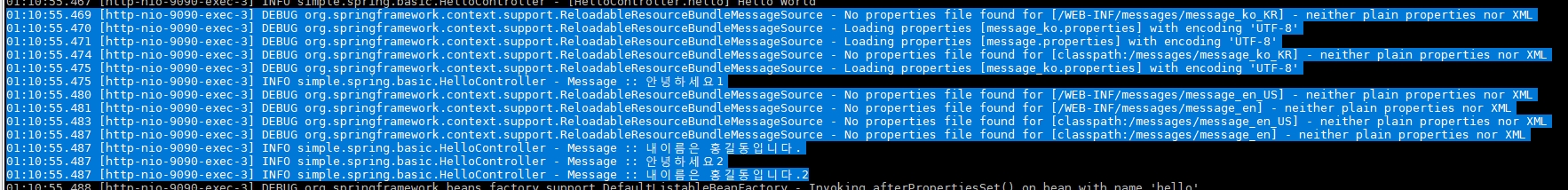logger.info("Message :: {}", messageSource.getMessage("mesage01", null, "default message", Locale.KOREA)); // 안녕하세요 출력