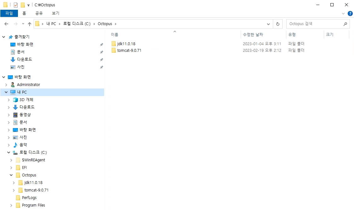 4. JDK 와 Tomcat의 압축을 원하는 곳에 풉니다. - 개인적으로 Octopus에 세팅했습니다.