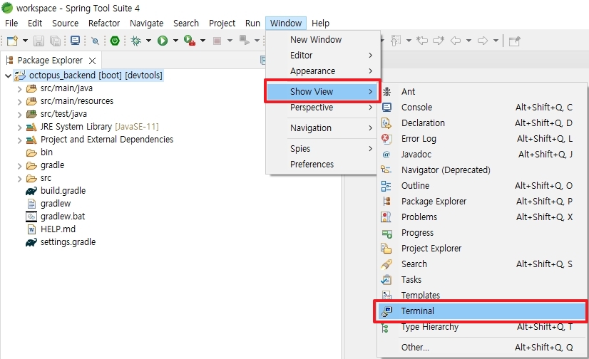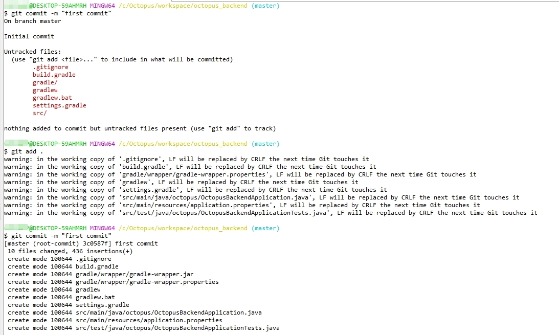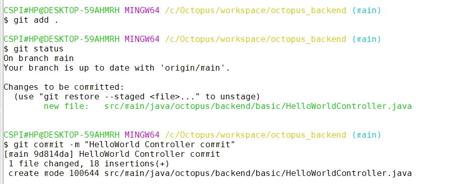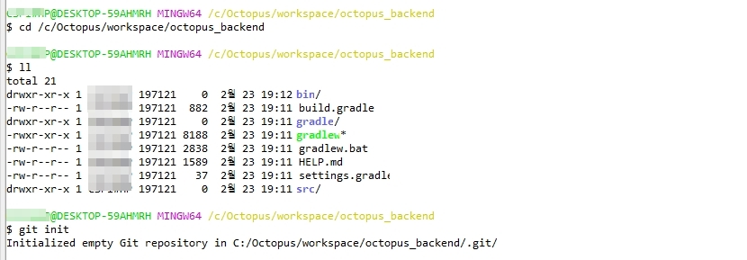 Git 프로젝트 폴더로 이동 >> cd /c/Octopus/workspace/octopus_backend
