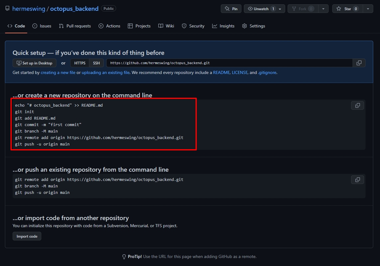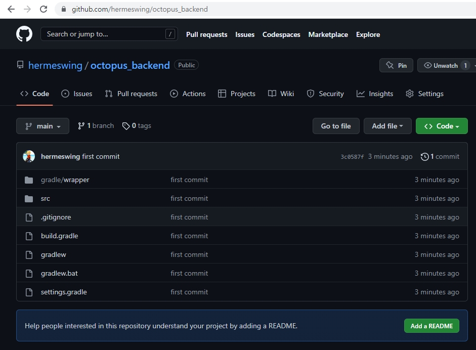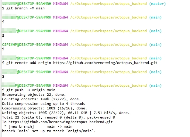Git 프로젝트 폴더를 Github Repository 와 연결 >> git remote add origin https://github.com/hermeswing/octopus_backend.git