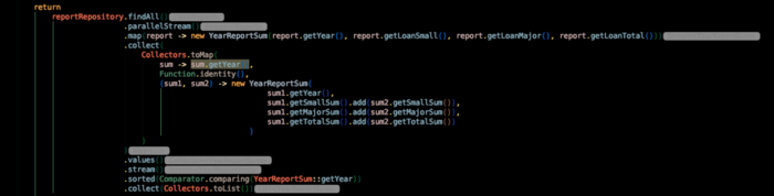 위 예제에서는 sum 값을 구하는 필드가 한 개 이상이기 때문에 Collectors.toMap 을 이용하여 Report.getYear() 를 기준으로 YearReportSum 을 생성하는 방식으로 사용하였습니다.