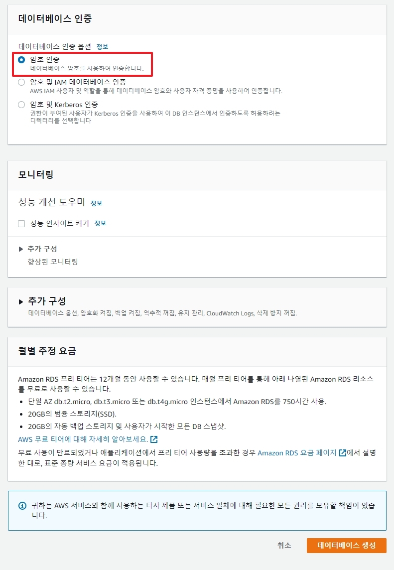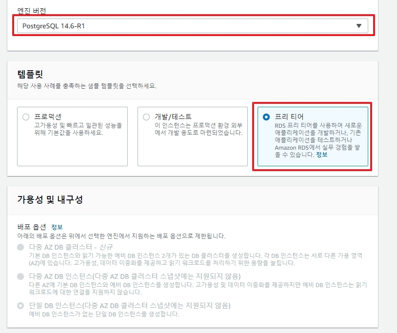 6. 데이터베이스 생성 >> 버전선택 - 프리티어 선택