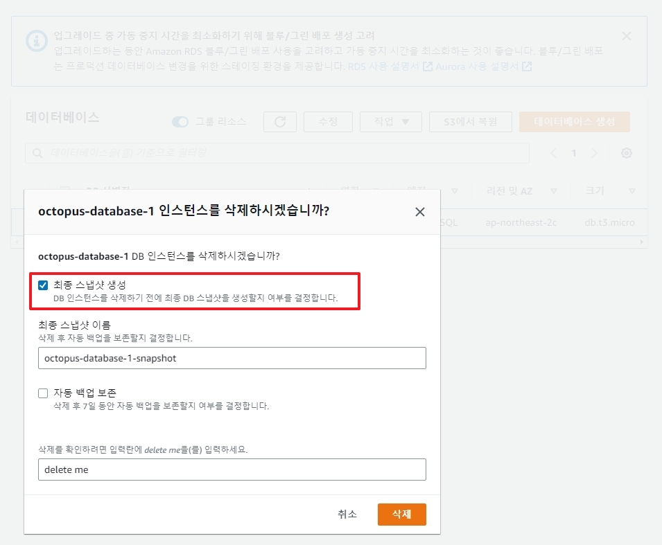 2. 최종 스냅샷 생성 체크 ( 둘 중 하나는 체크해야 합니다. ) > 삭제