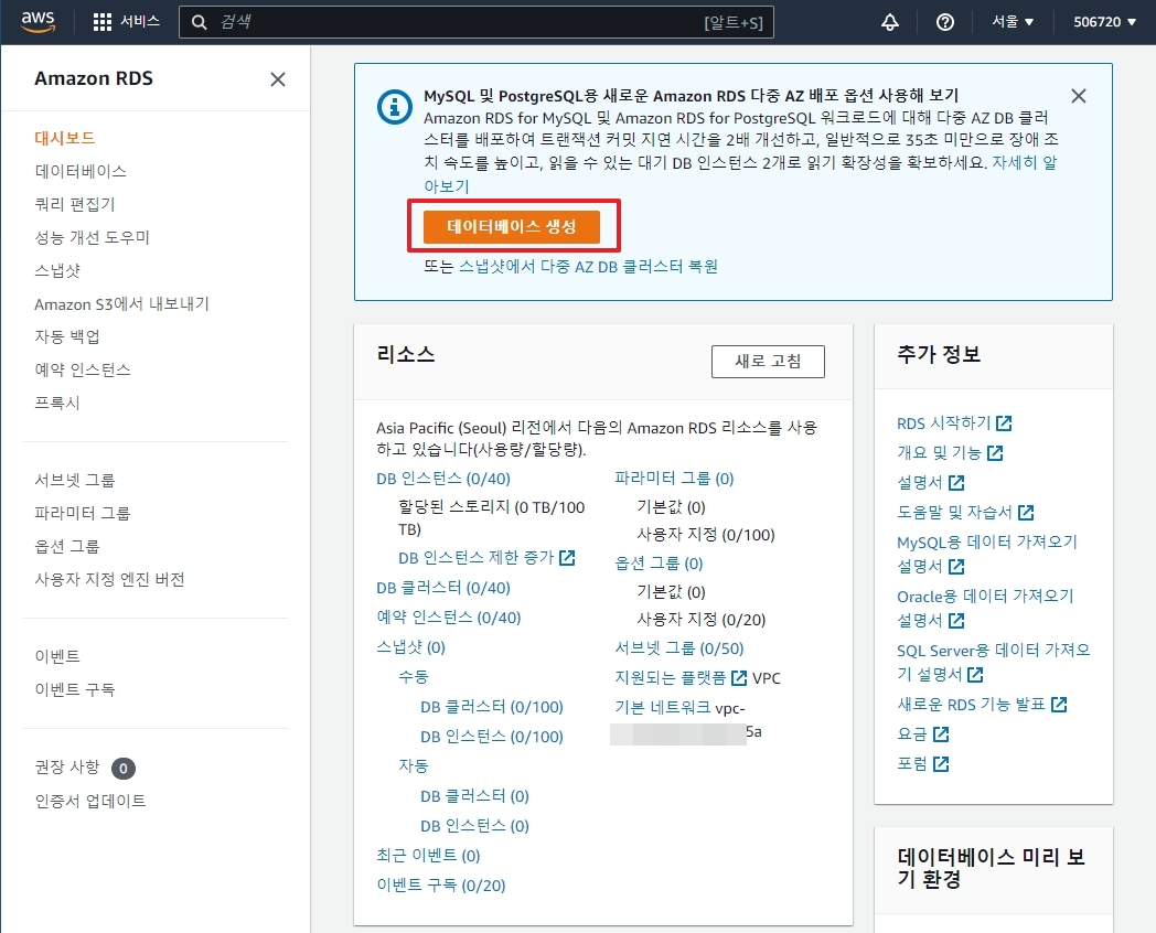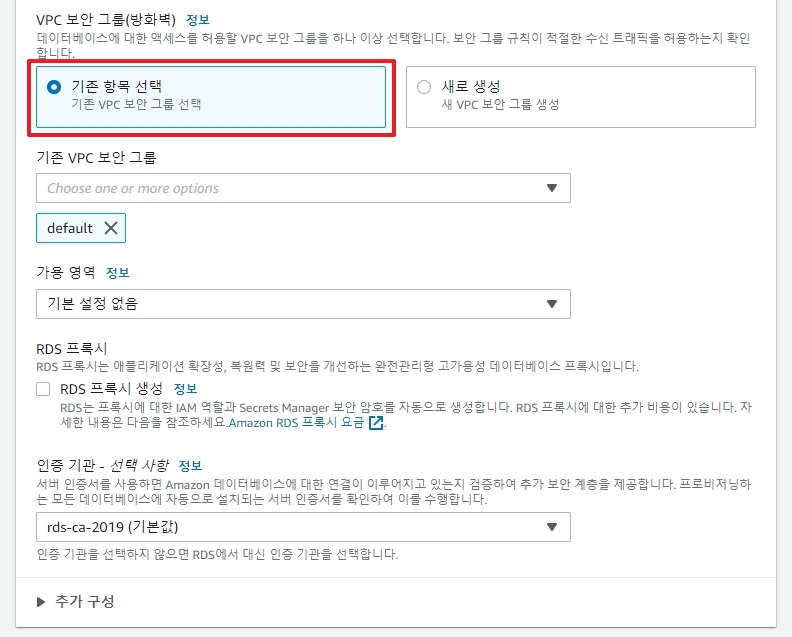 10. 데이터베이스 생성 >> 보안그룹 - 나중에 변경해도 됨.