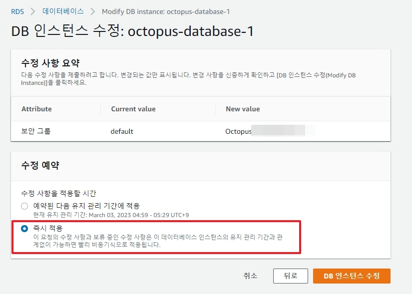 19. DB 인스턴스 수정 - 즉시적용 ( 서비스를 하고 있지 않기 때문.. )