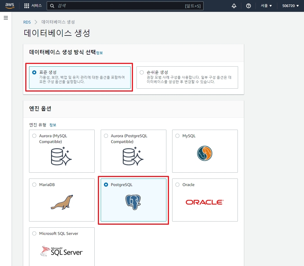 5. 데이터베이스 생성 >> 표준생성 선택 - PostgreSQL 선택