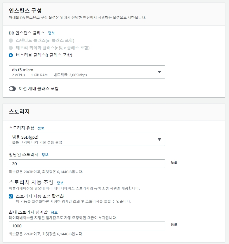 8. 데이터베이스 생성 >> 인스턴스 구성 - 버스터블 클래스 선택 ( Default )