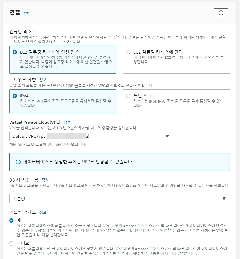 컴퓨팅 리소스 > EC2 컴퓨팅 리소스에 연결 안함. ( 독립된 DB Server 설정 )