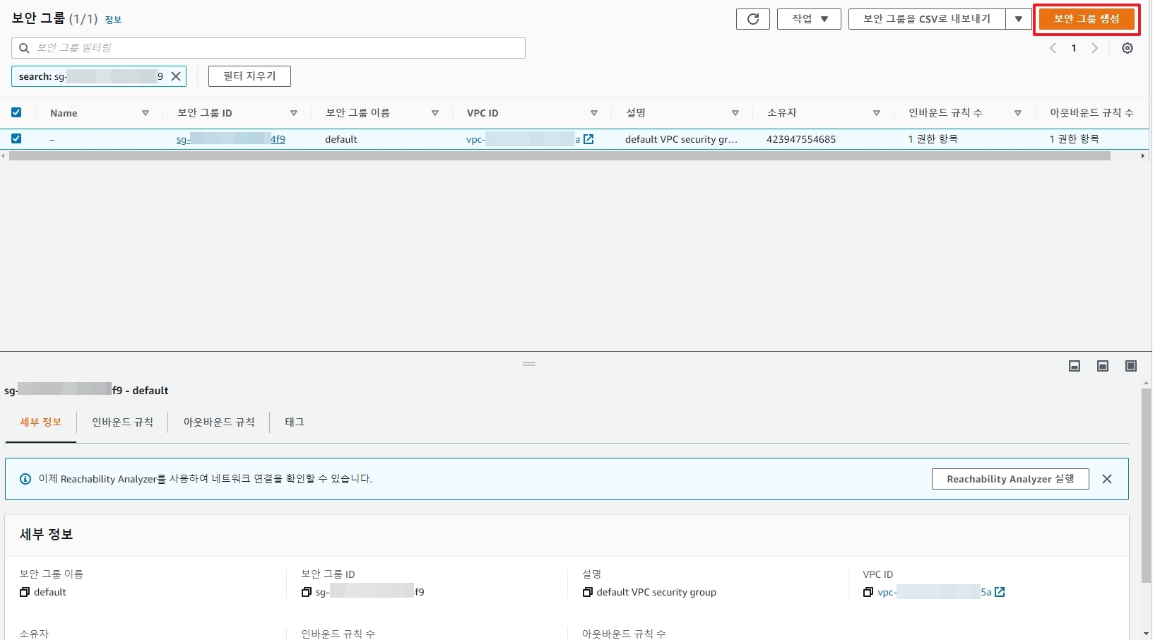 - 기존 보안 그룹 삭제 >> 생성한 보안 그룹 선택