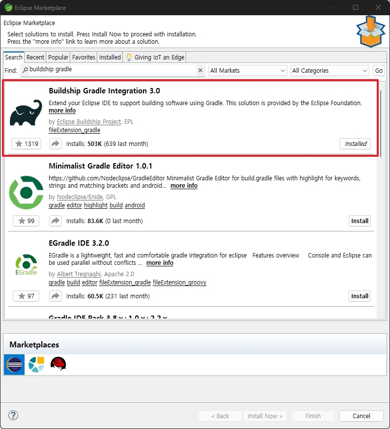 이클립스에서 Gralde Project 생성하기 Gralde Project를 생성하려면 우선 Gradle이 설치되어 있어야 한다. Eclipse Marketplace에서 Buildship Gradle Intergration 3.0을 설치하자. installed 표시가 아니라면 설치가 되어