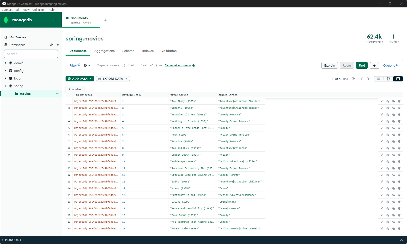 spring 이라는 Database 를 생성하고, movies 라는 Colection 을 생성 후 Data를 Import 한 내용입니다.